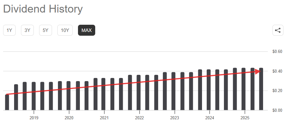 From an income perspective, VICI currently pays a dividend yield a little above five percent, comfortably supported by funds from operations. Unlike many high-yield names that stretch to sustain payouts, VICI’s dividend is both well covered and steadily growing. Since its public debut in 2017, the company has already raised its dividend significantly, building a strong track record of rewarding shareholders.