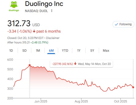 The company now has more than 47M daily active users, a number that continues to grow at a double-digit rate year after year. Over ten million of those users are paying subscribers, and that base keeps expanding as Duolingo introduces new premium features. Subscription revenue already accounts for more than eighty percent of total sales, giving the company predictable, recurring cash flow that resembles a software-as-a-service model more than a traditional app.