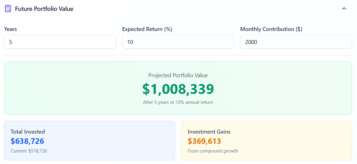 The Yieldly Dashboard has a built in compound estimate calculator that directly ties into my holdings. The tool estimates that my portfolio can reach $1M if I continue to average at least a 10% annual return and continue to contribute $2,000 a month.