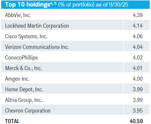 Looking at the top positions, we can see exposure to companies like AbbVie ABBV 0.00%↑, Lockheed Martin LMT 0.00%↑, Cisco CSCO 0.00%↑, Verizon VZ 0.00%↑, and Home Depot HD 0.00%↑ just to name a few.