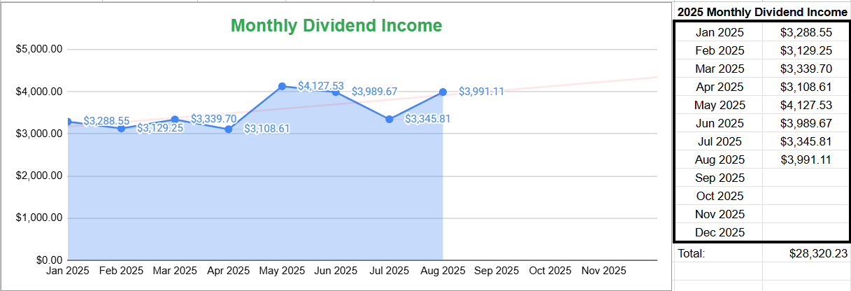 For the month of August, my dividend portfolio paid me $3,991.11 in dividend income. On a year-to-date basis, I’ve now collected over $28,000 in passive income with dividends. I aim to accumulate $100,000 annually in dividends and I want you to join me on the journey. This is money that I didn’t have to actively work for and doesn’t include capital earned through other business ventures.