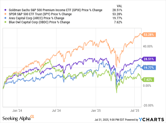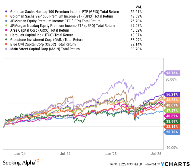 This makes covered call ETFs a compelling choice for investors that are specifically seeking income generation. Running a quick performance comparison, we can see that many of these covered call ETFs also offer very competitive performances to BDCs. Both GPIQ and GPIX outperform the included BDCs, with MAIN being the exception. However, this is a smaller time comparison and the outlook may look different if we allow more time to pass.