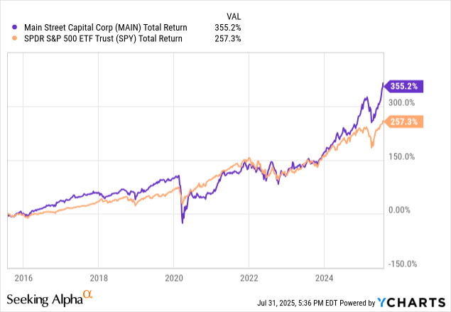 Additionally, BDCs like MAIN structure a portion of their investment portfolio as floating rate debt. This helps these BDCs generate amplified levels of income during periods where interest rates are elevated. However, the opposite effect is also true; lower interest rates can translate to lower net investment income. What makes a BDC like MAIN so special is management's ability to structure their portfolio in a way that can provide investors with returns through different interest rate environments. For instance, MAIN has provided a higher total return than the S&P 500 (SPY) over the last decade, which reinforces its efficiency.