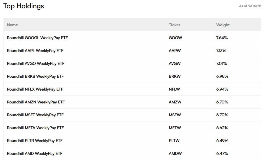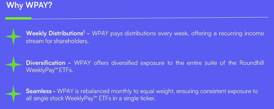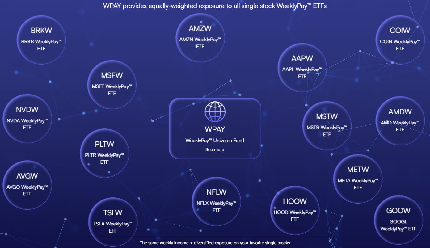 The second key reason is diversification. WPAY provides broad exposure to the entire suite of Roundhill's single-stock WeeklyPay ETFs. As the screenshots show, this includes a wide array of top-tier companies like: