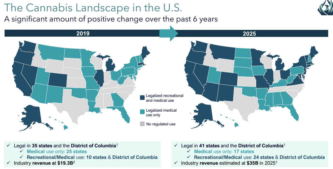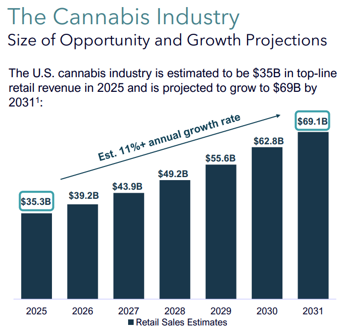Recent data projects the US cannabis industry will grow at a Compound Annual Growth Rate (CAGR) of 11% through 2031. This trajectory puts the industry on track to reach a staggering valuation of $69.1 billion. Yet, despite this growth, the market remains in its infancy. With recreational use legal in only 24 states so far, the runway for expansion is massive as more jurisdictions inevitably come online.
