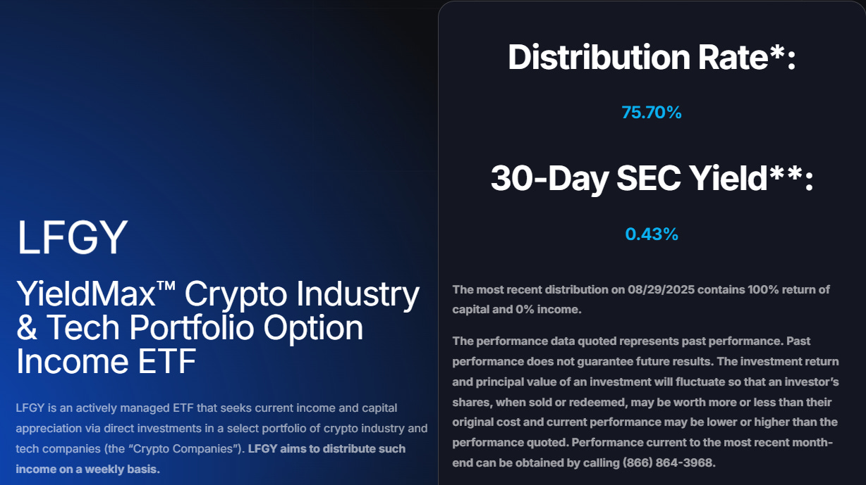 TL;DR - YieldMax Crypto Industry & Tech Portfolio Option Income ETF LFGY 0.00%↑ currently delivers an annualized yield of about 75.7%, paid out weekly to shareholders. The fund generates income through option strategies that include call writing and collars, which provide weekly cash flow but also cap upside potential. Payouts have been relatively steady since inception, although they could decline if the crypto sector or broader indices experience prolonged weakness. Many distributions are classified as return of capital, which can provide tax advantages, though the composition varies each week.