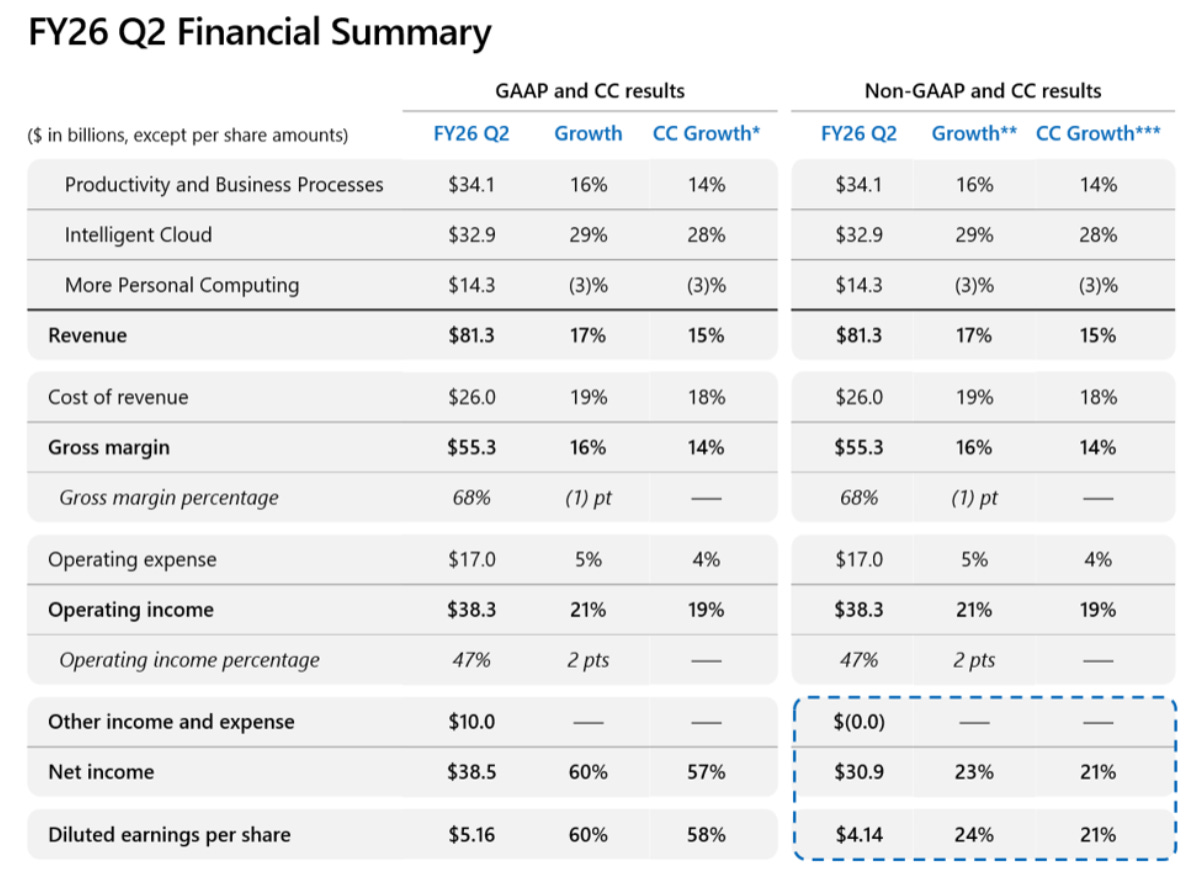 During the FY26 Q2 earnings update, Microsoft reported $81.3 billion in revenue, a 17% year-over-year increase, and an astounding $38.3 billion in operating income. The true growth vector lies in their ability to upsell their captive audience: