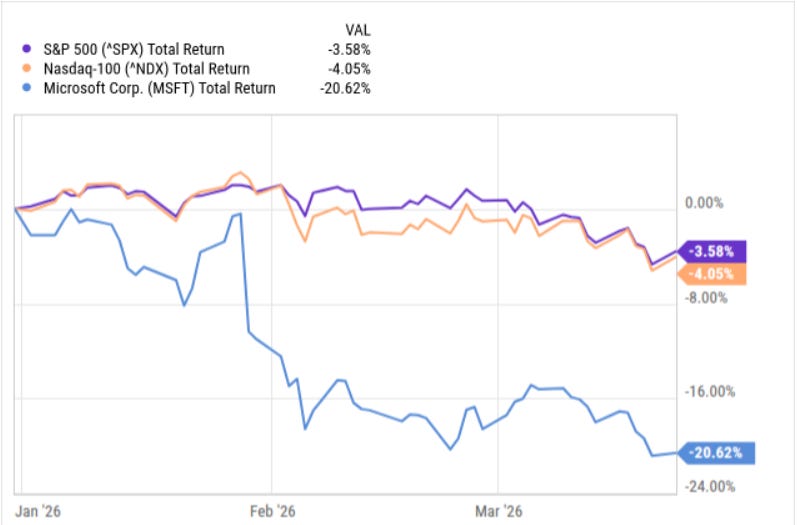 On a YTD basis, both the S&P 500 SPY 0.00%↑ and the Nasdaq-100 QQQ 0.00%↑ are down. However, Microsoft MSFT 0.00%↑ is down more than 20%.