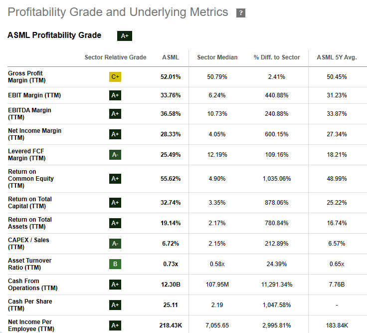 The bookings miss (vs. €4.8 billion expected) was a focal point of the market’s negative reaction, despite being partially expected due to quarterly volatility and order lumpiness. Gross margins exceeded guidance and reflected solid operational execution. ASML currently earns an A+ rating in terms of profitability!