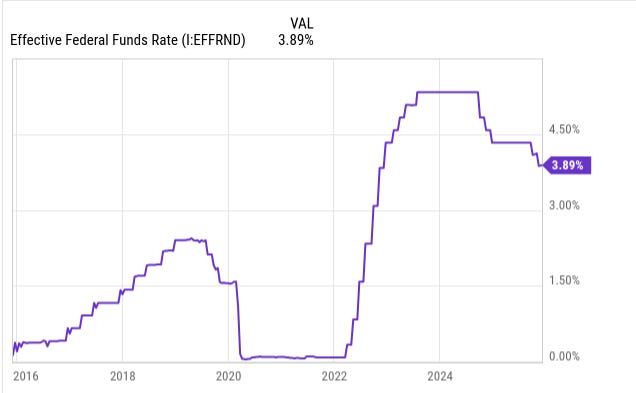 The first corner of the triangle anchors the portfolio in tangible assets. With the Federal Reserve signaling a stabilizing or declining rate environment for 2026, the sector poised for the most aggressive recovery is Real Estate. As we can see below, the federal funds rate was aggressively hiked to ten year highs throughout 2022 and 2023. This was done in response to record breaking inflationary data, as well as in reaction to the pandemic. The Fed had cut rates twice this year so far, but the federal funds rate still remains near its ten year highs.