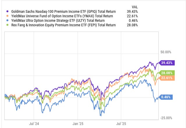 As we can see below, GPIQ (purple) has the highest total return due to its ability to participate in market rallies. I believe that GPIQ has proven to be a safe forever hold.