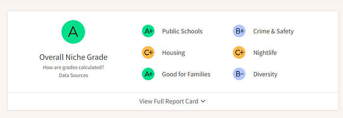 You get a grading system for each important category. This includes public school quality, housing in terms of affordability and availability, good for families, diversity, nightlife, and crime & safety. These are all the important highlights that you can get at first glance before diving in deeper.