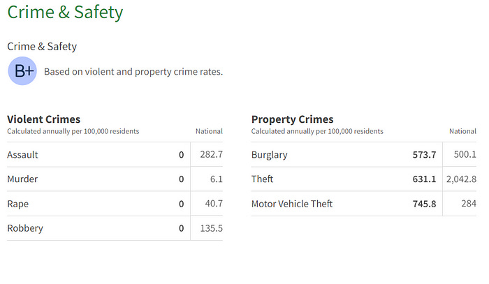 Each segment of the grade is broken own with relevant stats to support the grade. For example, taking a look at the crime ratings for Alpine, we can see the below. We can see how many property crimes are in the area between burglary, theft, and car theft. We can also see the rate of violent crimes and in this case, Alpine has virtually none.