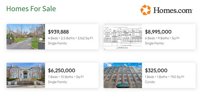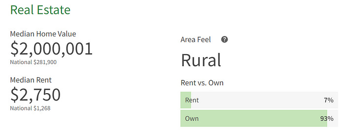 Once you find a town, you can see more details on the people and real estate within the town. For example, lets take a look at Alpine New Jersey together. You can see the median home value and the median rent for the area. You can also see the breakdown between what percentage of the town rents versus how many people own their home.