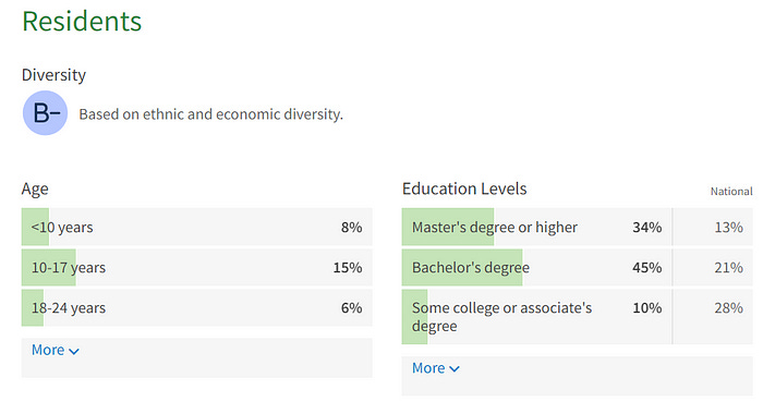 We can also see the diversity score encapsulates the percentage of people within each age bracket. In addition, we can see what percentage of the town is college educated and what percentage is not.