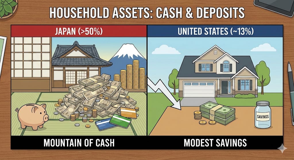 Japanese households are sitting on a mountain of cash. According to the Bank of Japan, households here hold over 50% of their financial assets in cash or savings deposits. In the United States, that number is closer to 13%.