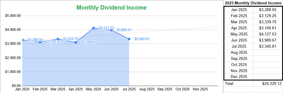 For the month of July, I’ve been able to collect $3,345 in dividend income. This was an increase of 7.6% from the prior quarter’s amount (April). I was able to passively increase my dividend income by reinvesting portions of the dividends received, back into different high-yield funds. This growth could have been more aggressive if I chose to roll dividends back into income positions, rather than growth.