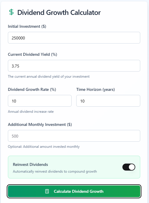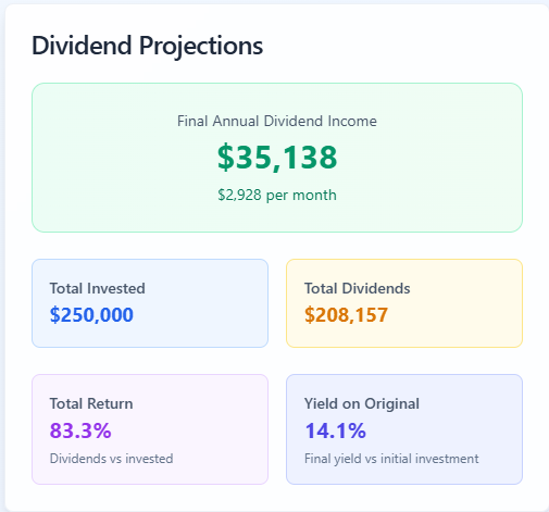 $250K x 3.5% dividend yield = $8,750 per year in dividend income on year 1.