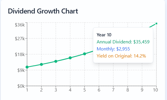 In year 10, your annual dividend income would now be over $35K on your original investment, without you adding an extra capital during this time frame. This would be an extra ~$3,000 per month, which is extremely useful for a retiree.