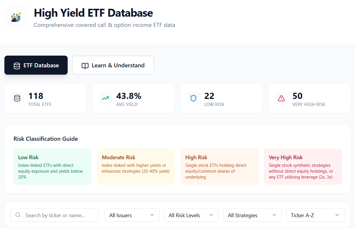 We have funds providing dividend yields above 50% nowadays, and it can be difficult to determine the risks associated. To solve this, I have spent the last few months building the High Yield ETF Database. This is a comprehensive, professional-grade tool designed to give you “X-ray vision” into every major covered call and options income fund on the market today.