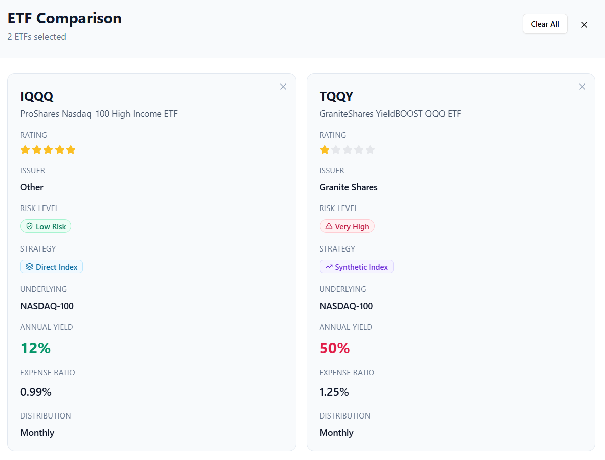 Many of the highest yielding funds today do not actually own the underlying stock. They use Total Return Swaps and derivatives to mimic price action. The database explicitly flags these “Synthetic” strategies, which is critical for understanding your upside participation and your risk during market volatility. Compare the risk profile of different funds.