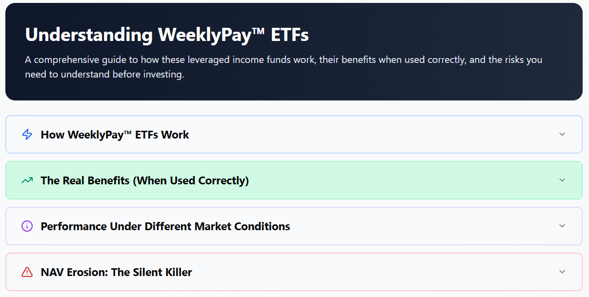 The market is shifting toward weekly distributions. My database includes a dedicated breakdown of how these specific funds utilize leverage and swaps to generate that cash flow. We show you exactly what happens to the fund when the underlying stock rises versus when it falls, so you are never surprised by a distribution cut.