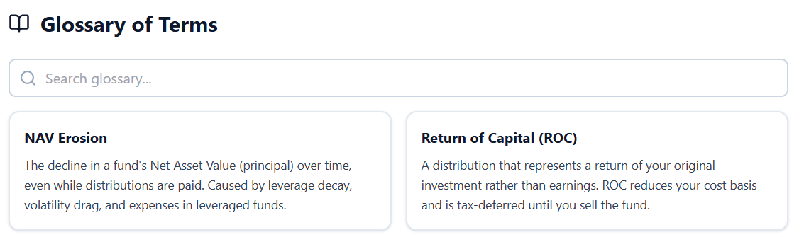 I want my subscribers to be the most informed investors in the room. The database includes a full glossary of terms. Whether you need to look up the 30-Day SEC Yield or understand how a Covered Call Strategy caps your upside, the definitions are built right into the interface.