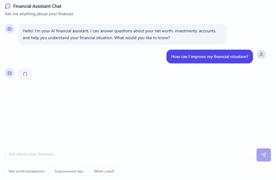 Stop guessing. Track your full Net Worth, monitor the Top 10 Cryptos, and get personalized advice from your new AI Financial Assistant.