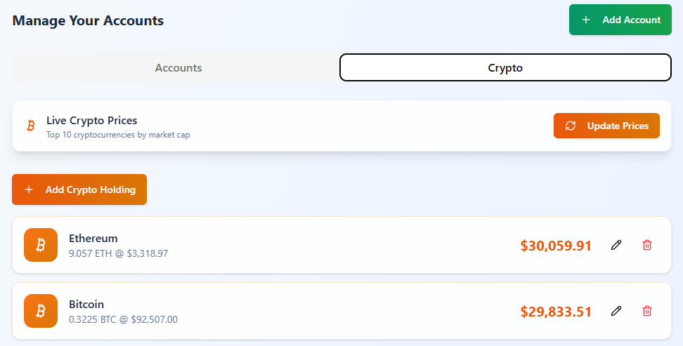 Beyond just tracking your own Bitcoin or Ethereum, you can now monitor the broader market. We have added a Live Crypto Prices feed that tracks the top 10 cryptocurrencies by market cap. With a single click of the “Update Prices” button, you can instantly refresh market data.