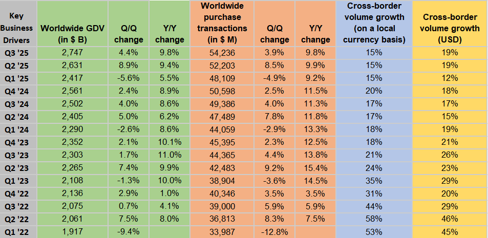 Mastercard’s most recent quarter looked like a company that hasn’t lost a step. Revenue grew almost 17% and EPS came in ahead of expectations. When you look under the surface, the strength becomes even clearer. Gross dollar volume increased, purchase transactions climbed, and cross border activity continued its powerful recovery. Cross border spending has always been one of Mastercard’s highest margin categories, so that strength matters.