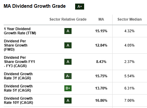 Looking at the screenshot below, we can see that Mastercard has averaged an annual dividend raise of 16.86% over the last DECADE. Can you imagine receiving such a large double-digit raise from your job every year for a decade straight?