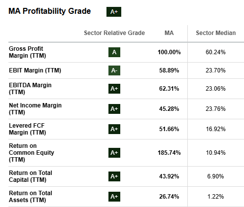 Mastercard’s profitability metrics are crushing the rest of the financial sector. As we can see below, MA is simply earning cash hand over fist.