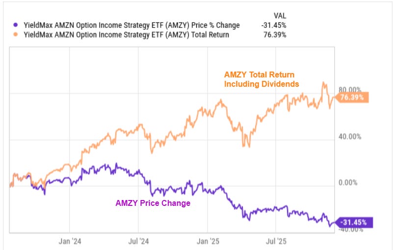 Ideally, we want the total return including dividends to outpace the share price decline. A successful example can be seen when looking at the performance of the YieldMax AMZN Option Income ETF AMZY 0.00%↑. AMZY offers a dividend yield that typically falls around 50%. We can see that AMZY’s share price has declined, but the total return including all dividends paid has outpaced. This means that AMZY has proven to be a successful addition within my portfolio.