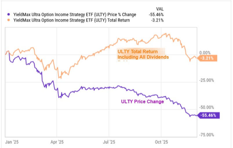 An important lesson is that a high dividend yield doesn’t automatically result in a high total return. So even if ULTY offers a dividend yield of 77%, you should not expect to actually collect 77% a year. We can refer to ULTY’s performance on a YTD basis below. The fund has seen its share price decline by a massive 55.46%. When including all dividends paid, the total return is still a loss of 3.21%. This concept is what is referred to as NAV erosion. ULTY has ultimately paid out more than it actually generates in income, leading to these large losses.