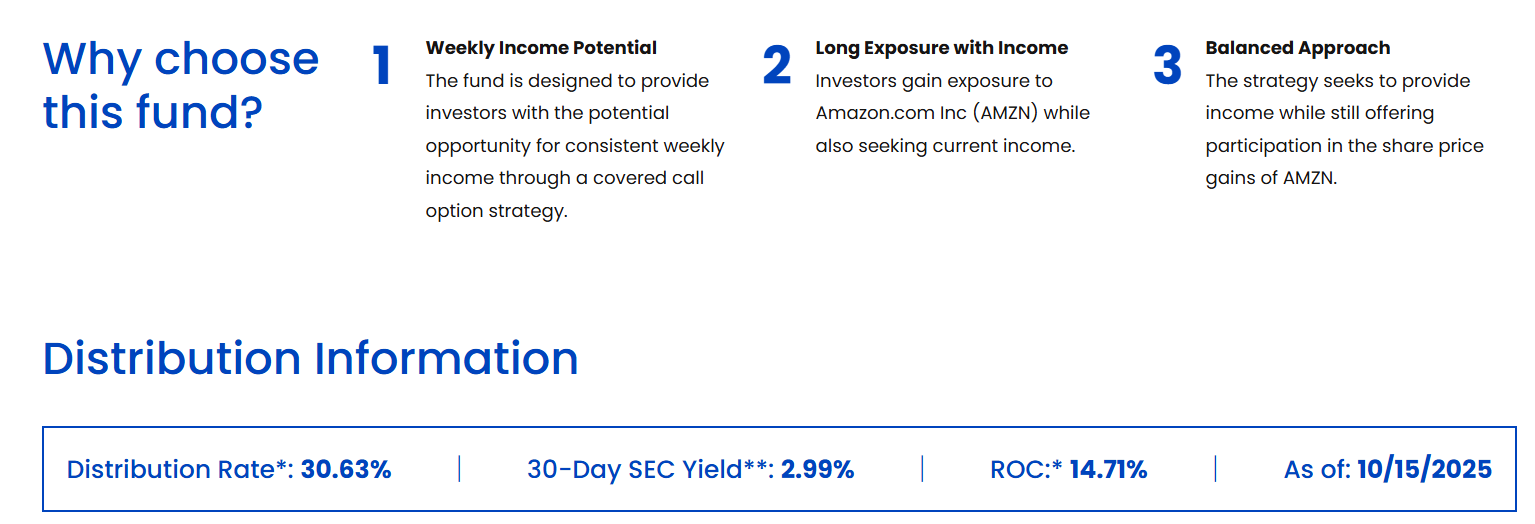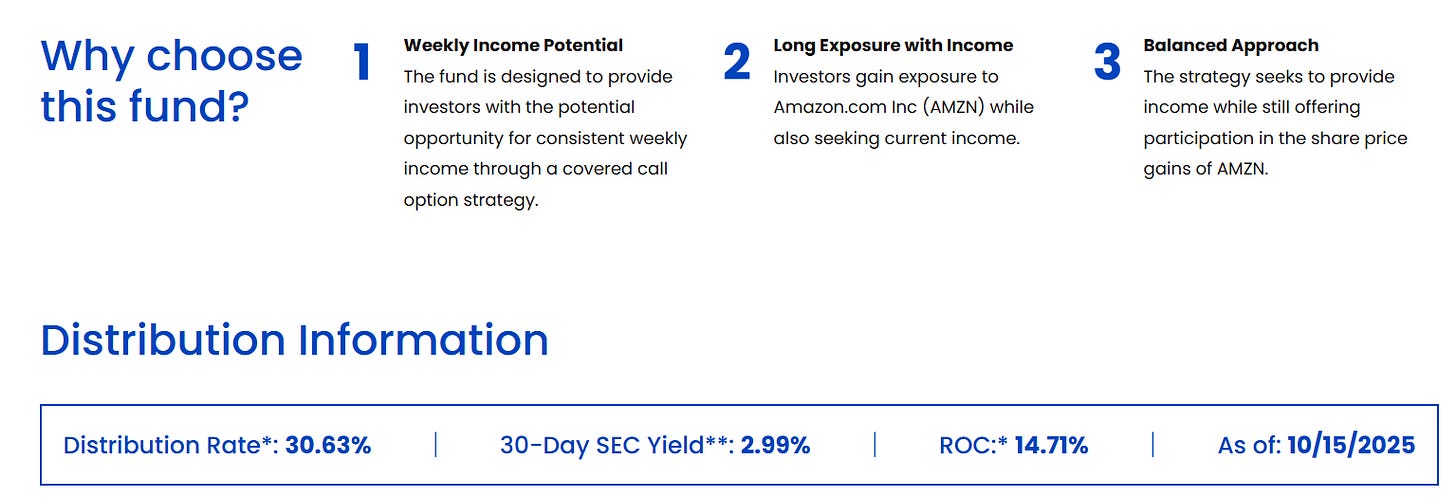YieldMax AMZN Option Strategy ETF AMZY 0.00%↑ – A newer income ETF built around Amazon’s stock. It sells covered calls on AMZN to generate high monthly income, offering a way to monetize volatility on a top-tier growth name. I use this as a tactical yield play when I want exposure to Amazon without directly holding the shares.