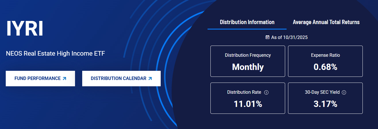 For instance, a fund like NEOS Real Estate High Income (IYRI) can provide an 11% dividend yield on invested capital, while giving you exposure to some of the highest quality real estate businesses in the world.