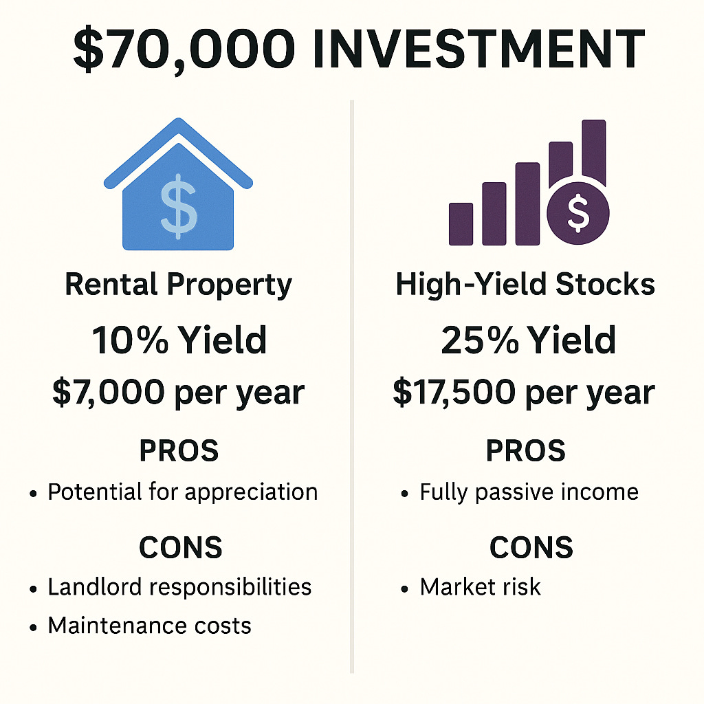 Now consider a high-yield dividend portfolio. A mix of funds such as WPAY, IYRI, and GPIQ can generate yields between 10 and 15 percent annually. Investing the same $70,000 in these income-focused ETFs could produce $7,000 to $10,000 per year in completely passive income. There are no tenants to manage, no property taxes to pay, and no surprise repair costs.